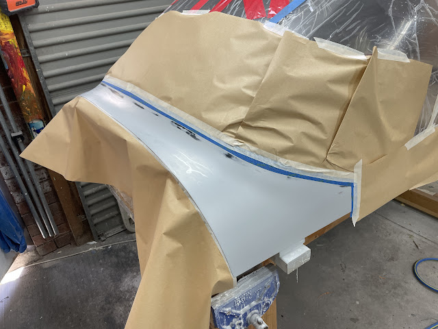 The 5th coat of primer was wet sanded using 400 grit. There seem to be a few pin holes still left, but there is no way i am hitting them with blade putty now! So a 6th coat of primer was sprayed on thickly. This was then wet sanded using 600 and 800 grit soft sanding sponges. All the pin holes are now gone, and the finish looks awesome. There are a few scratches where something got under the sponge, as well as a couple of areas where i've sanded some paint off ot the underlying surface. However, you have to make a decision at some point that you are finished - fibregalss work will go on forever otherwise. Plus, there couldn't be a 7th coat of primer without waiting a few weeks to get some more EkoPoxy from Stewart Systems in the states!
